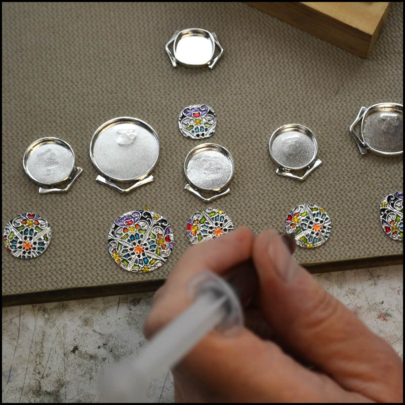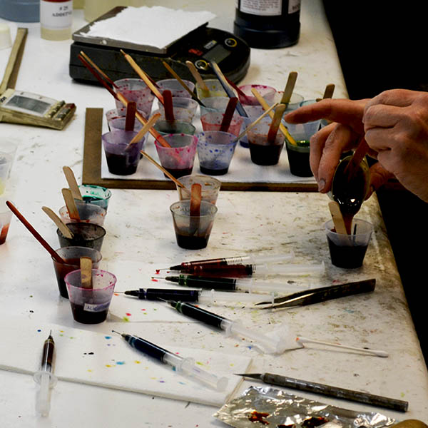 The heat-set epoxy resin is colored with transparent pigments and carefully applied over